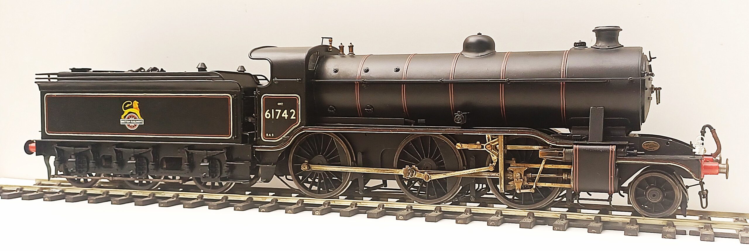 BR (ex GNR) Gresley class K2/1 2-6-0 no. 61742. This lovely model has been expertly built from scratch by Harold Humphries. In my early days of gauge O model building, a good friend of mine by the name of Graham Jaques used to tell me about “Harold”, an elderly gentleman who Graham looked upon as being his modelling mentor. Harold passed away and Graham, (who was a superb builder himself, good enough to win the Guildex Chairmans trophy with a scratchbuilt and painted GNR Atlantic) acquired this model. Now after Graham’s passing some years ago, I have acquired it and I must say that the old gent really could build a superb model loco. ABC gears, Slaters wheels and current collection by plunger pickups, this K2 runs very smoothly and powerfully.